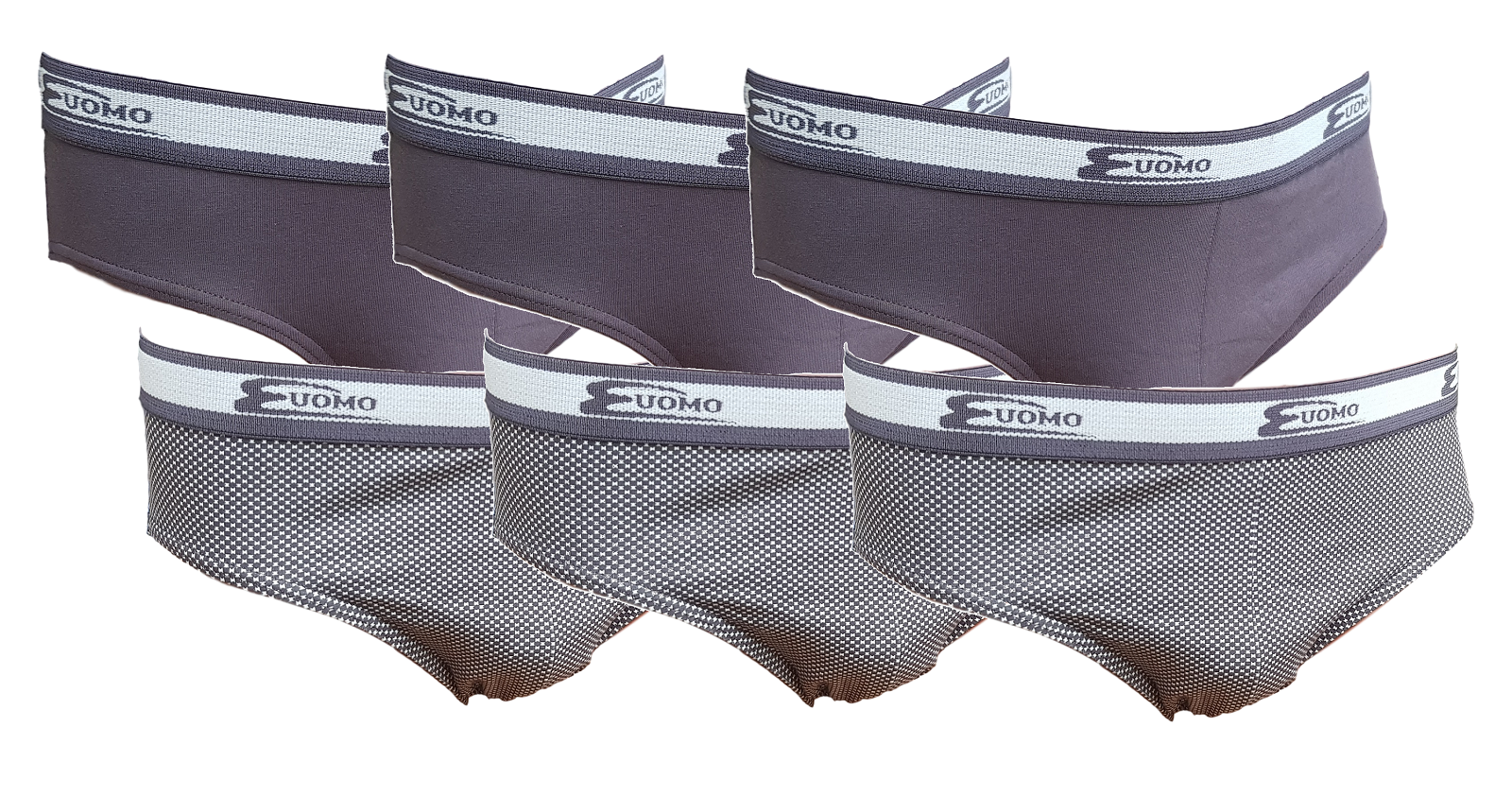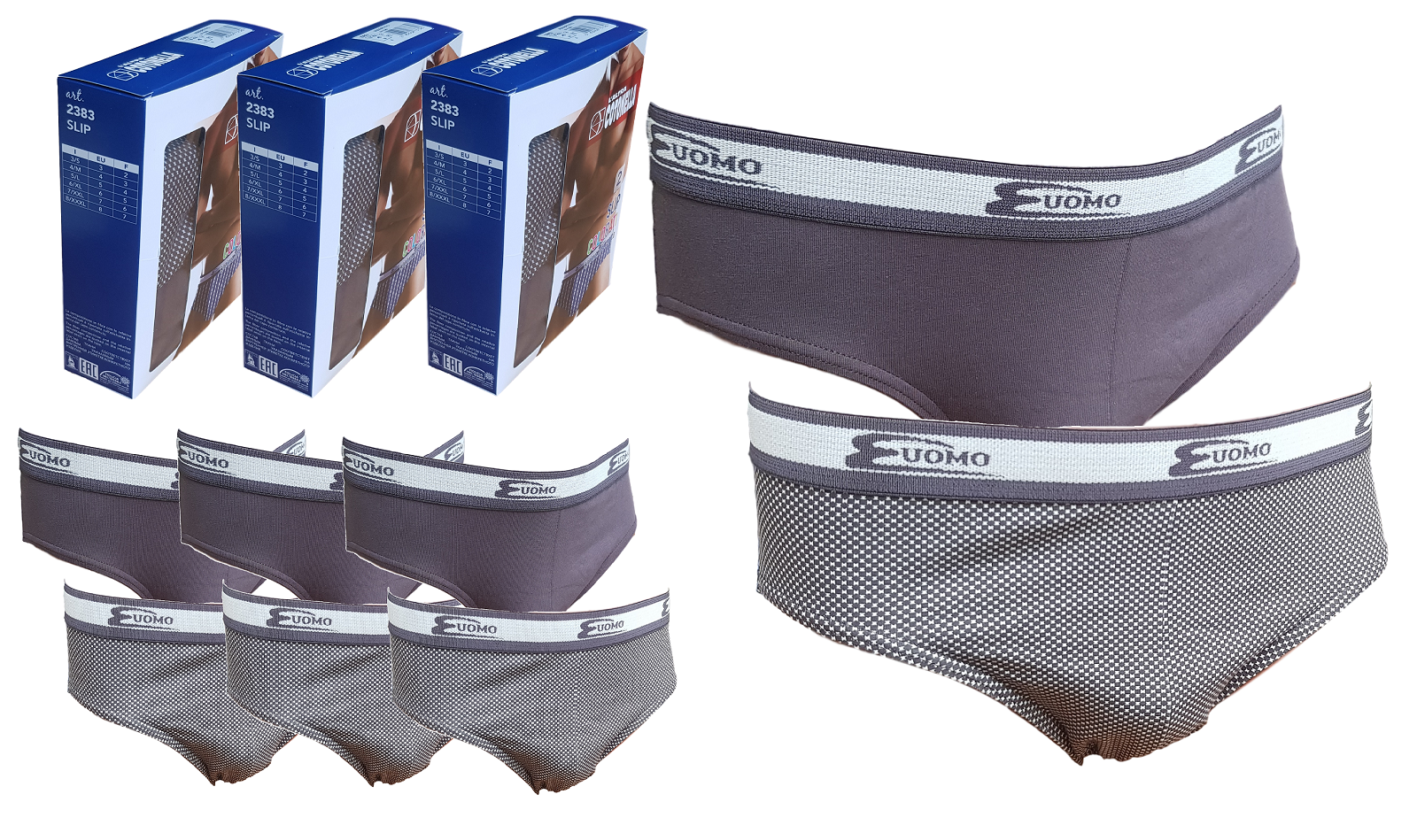 6 Slip da Uomo NOTTINGHAM con elastico esterno in Cotone. Marca: NOTTINGHAM Articolo: 14944 Tipo oggetto: Slip Genere: Uomo Tessuto: 94% Cotone - 6% Elastan Unità nella confezione: 6 Slip Colori nella confezione: 2 Grigio + 2 Jeans + 2 Nero Confezione: Scatola
