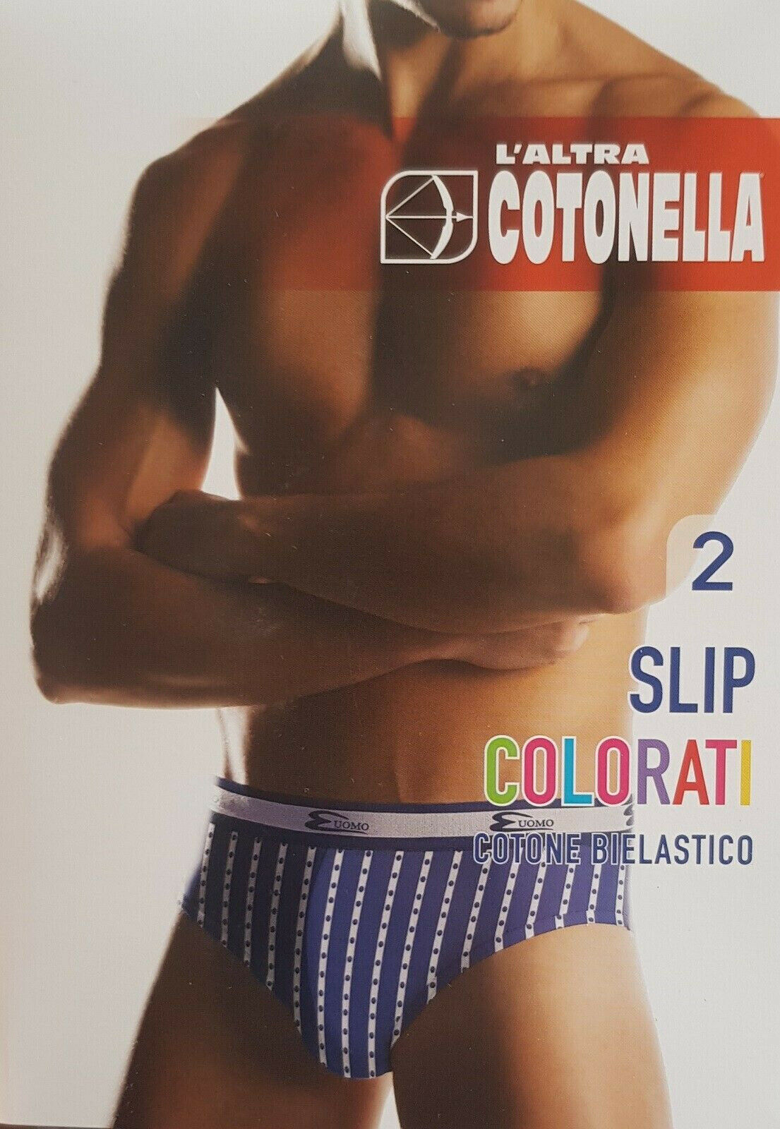 2 Slip Uomo elastico esterno in Cotone bielastico. Marca: L' altra COTONELLA Articolo: 2383 Colore: 0I100 Tipo oggetto: Slip Genere: Uomo Tessuto: 95% Cotone - 5% Elastan Unità nella confezione: 2 Slip Confezione: Scatola