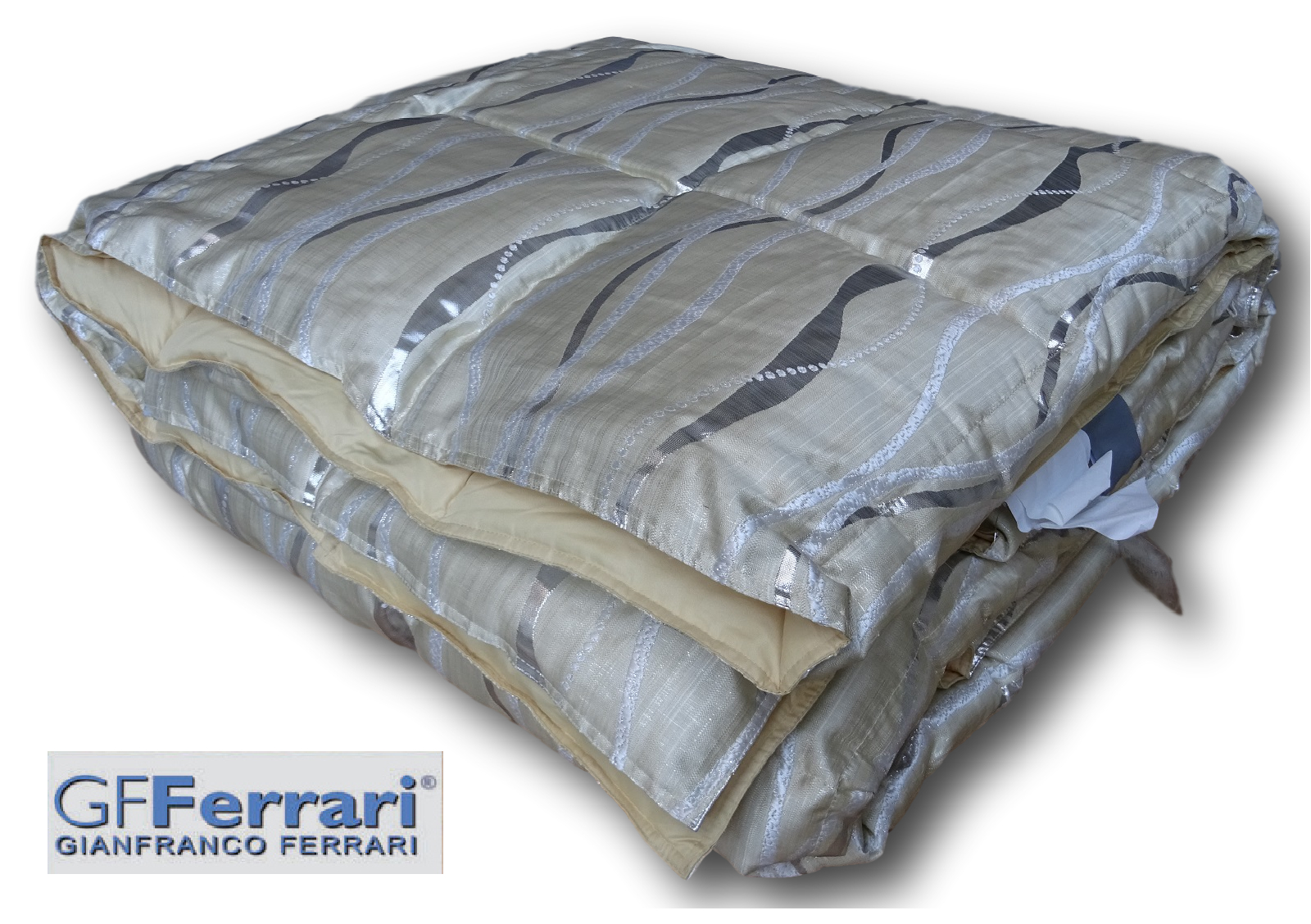 GIANFRANCO FERRARI Trapunta, Piumone Invernale + 2 Fodere cuscini. DESCRIZIONE DEL PRODOTTO Marca: GF. FERRARI Trapunta - piumone invernale KATIA + 2 Fodere cuscini. Articolo jacquard in pregiato tessuto di viscosa con lavorazione a capo. Caratteristiche; Matrimoniale; cm. 265 x 265 Tessuto superiore in Viscosa Fodera inferiore 100% cotone Imbottitura in poliestere anallergico 100%. Peso imbottitura 350gr. mq. Colore SETA MADE IN ITALY