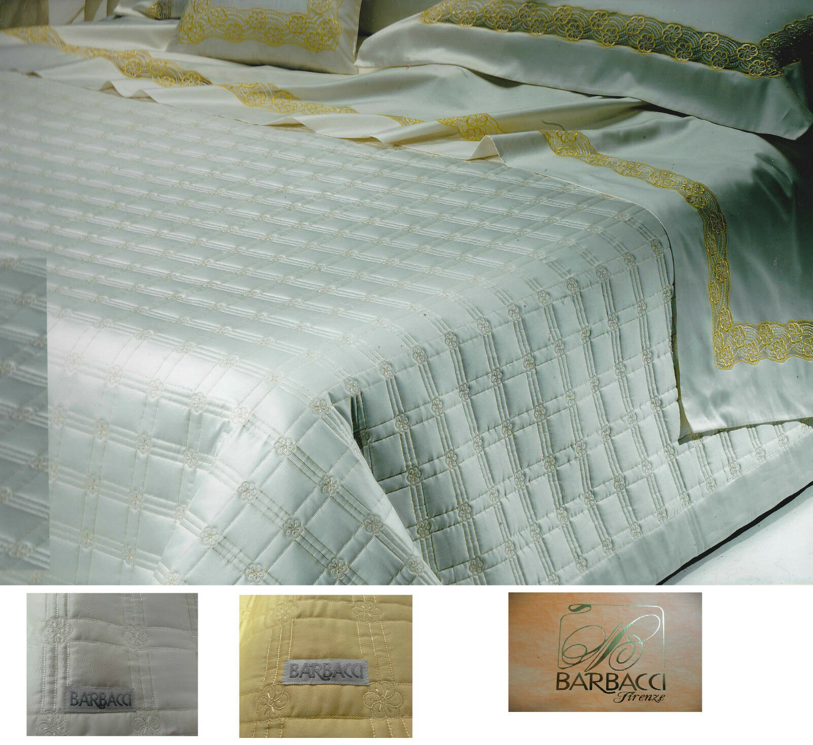 GF. FERRARI QUILT - TRAPUNTINO - DESCRIZIONE DEL PRODOTTO Marca: GF. FERRARI Quilt - trapuntino estivo disponibile nella versione matrimoniale. Tessuto metallizzato ricamato. Confezionato a mano. CARATTERISTICHE; Matrimoniale; cm. 260x260 Fodera in rasatello Imbottitura in poliestere anallergico 100%. Peso imbottitura 100gr. mq. Colore disponibile - Multicolore