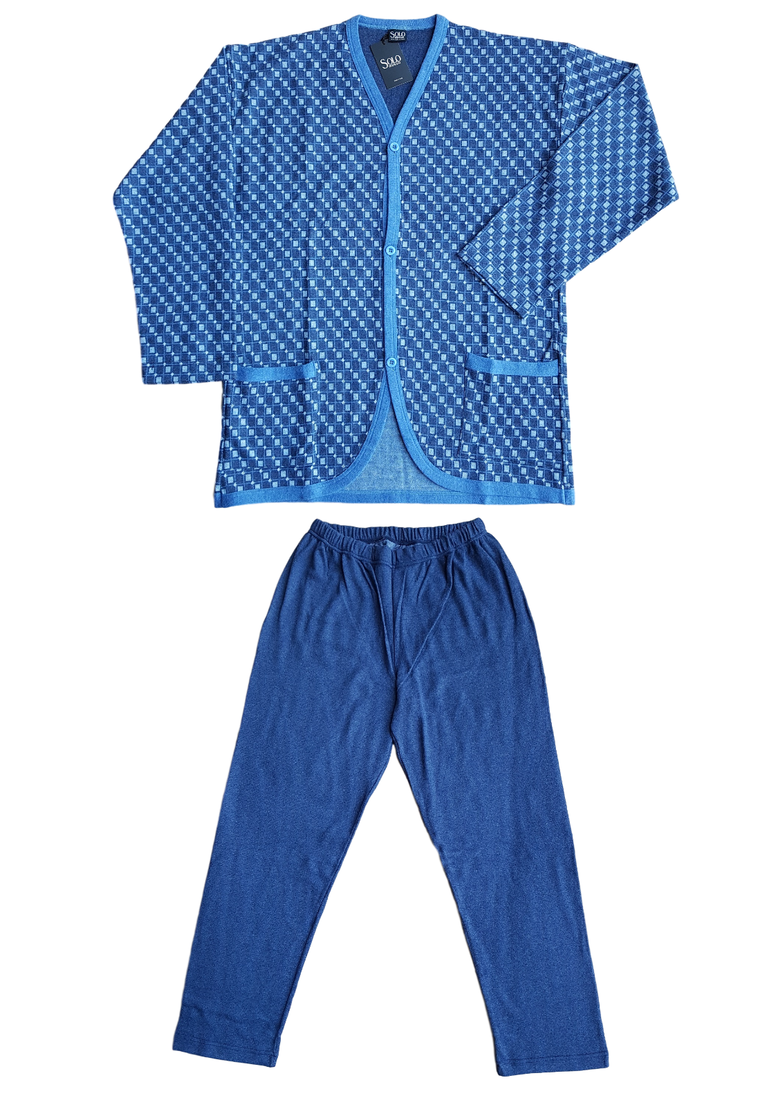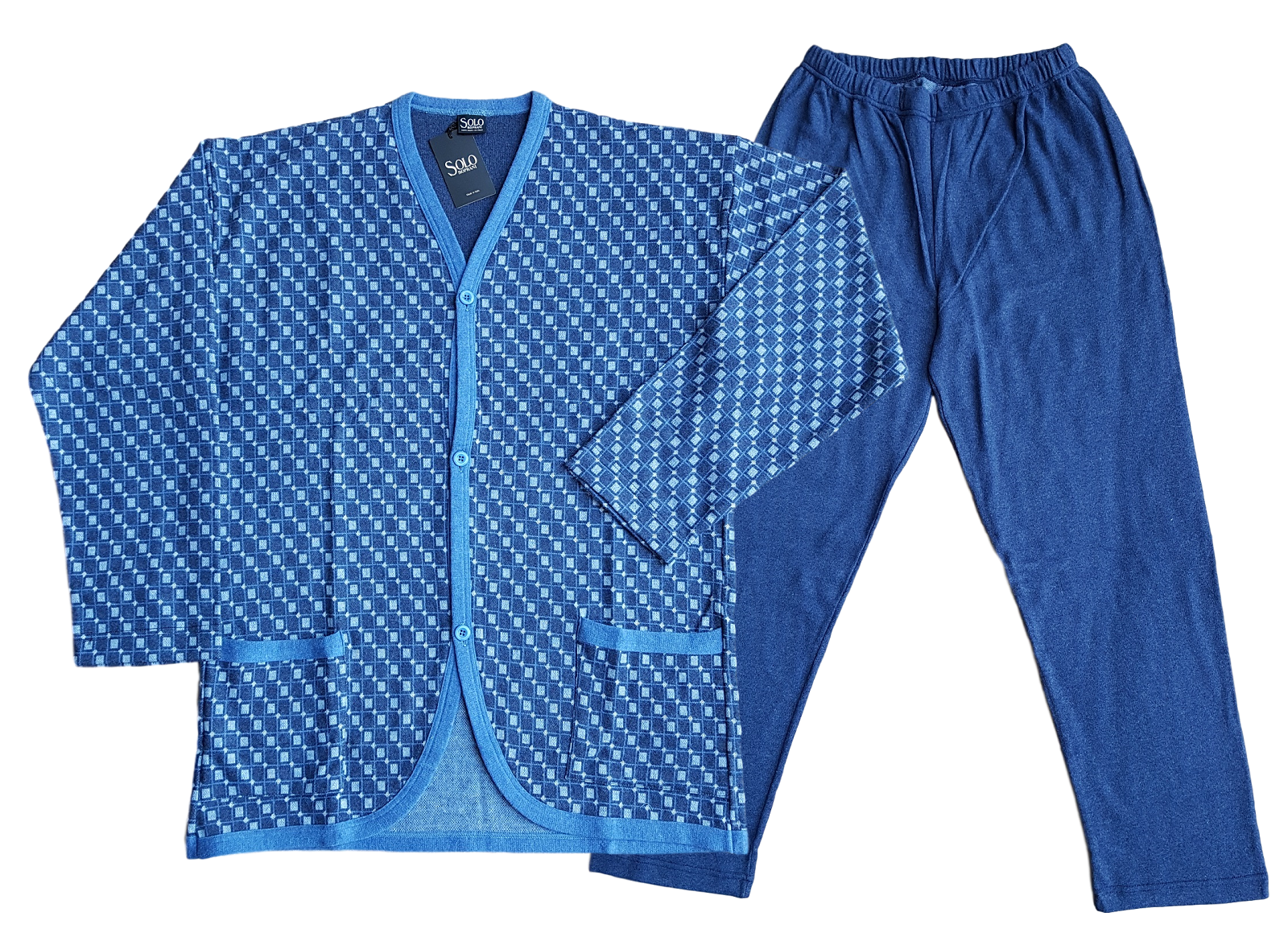 Pigiama lungo collo serafino manica lunga tinta unita pantaloni fantasia in jersey. Linea Forniture Italiane, stile contemporaneo. Marca: RAGNO SPORT Articolo: U103N1 Tipo oggetto: Pigiama completo Genere: Uomo Composizione: 100% cotone Periodo consigliato: Primavera Confezione: Scatola