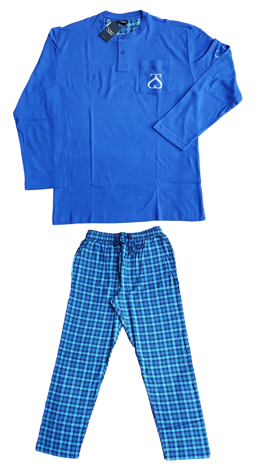 Pigiama lungo collo serafino manica lunga tinta unita pantaloni fantasia in jersey. Linea Forniture Italiane, stile contemporaneo. Marca: RAGNO SPORT Articolo: U103N1 Tipo oggetto: Pigiama completo Genere: Uomo Composizione: 100% cotone Periodo consigliato: Primavera Confezione: Scatola