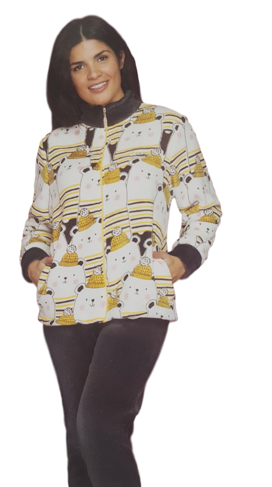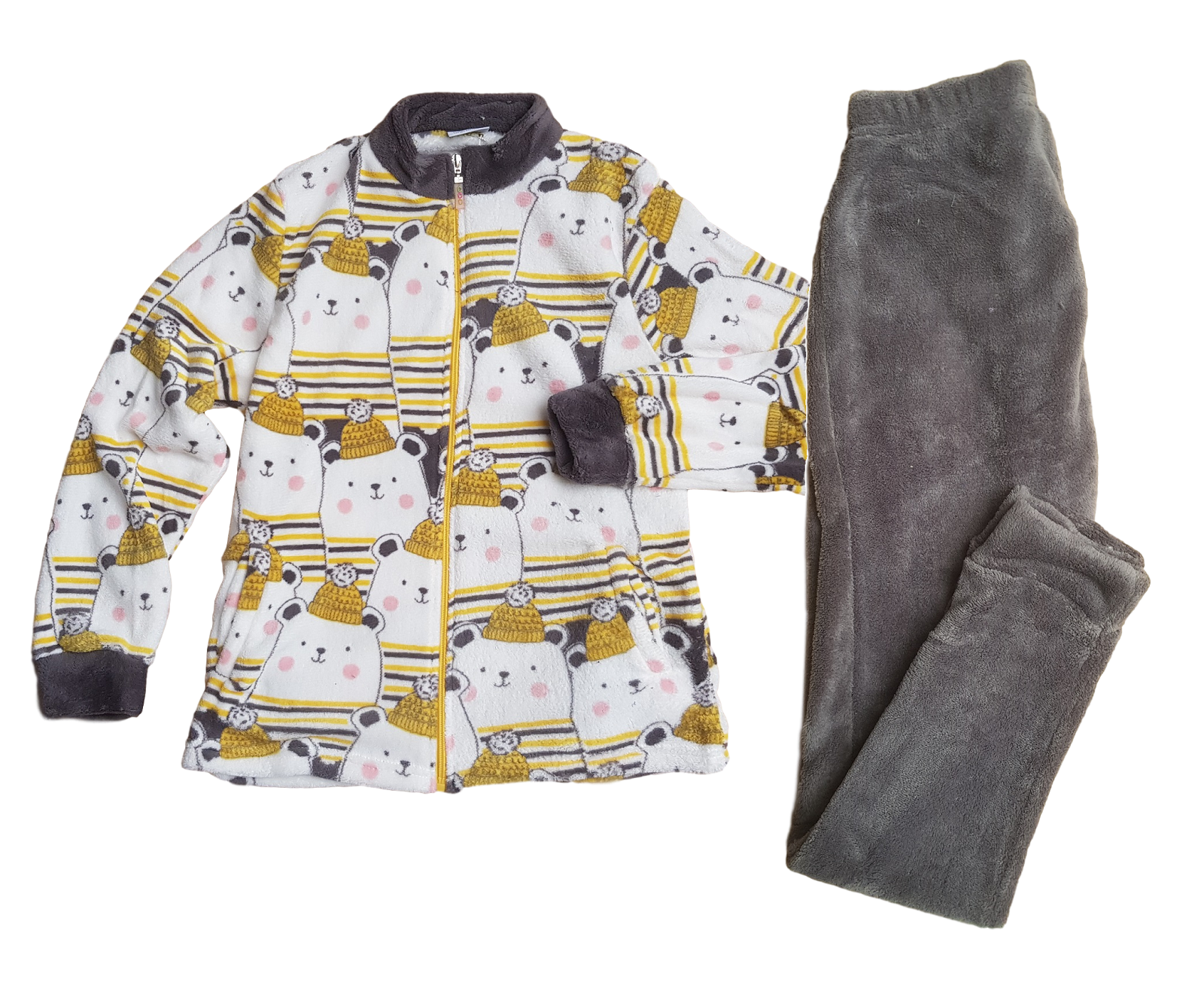 Pigiama Donna Invernale in morbido tessuto Coral con polsini alla maglia e al pantalone. Maglia aperta con zip e tasche laterali.