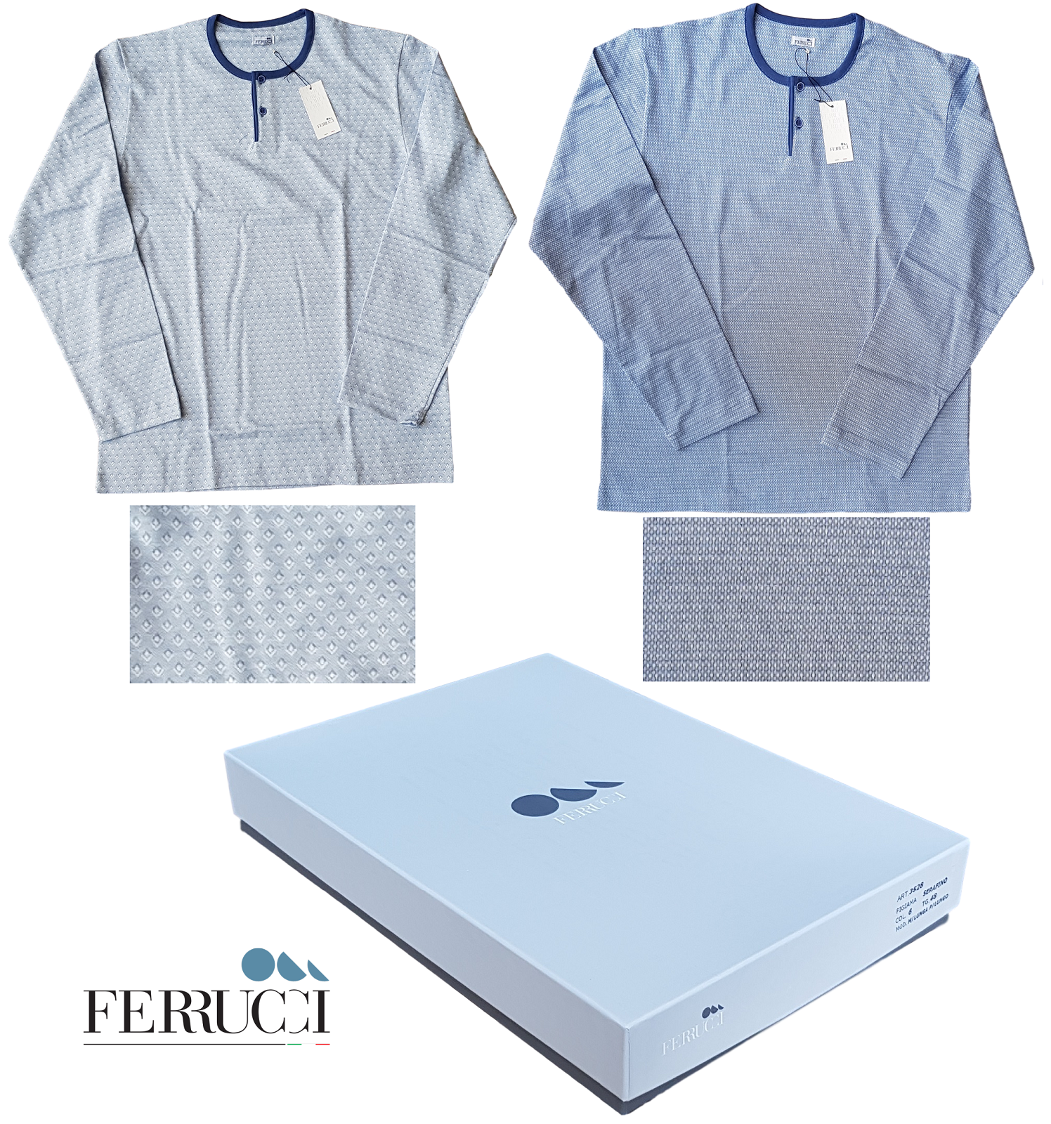 Pigiama lungo bordato collo serafino manica lunga , pantaloni con taschino posteriore. Marca: FERRUCCI Articolo: 3911 RIFT Tipo oggetto: Pigiama completo Genere: Uomo Composizione: 100% Cotone Periodo consigliato: Primavera / Estate Confezione: Scatola MADE IN ITALY