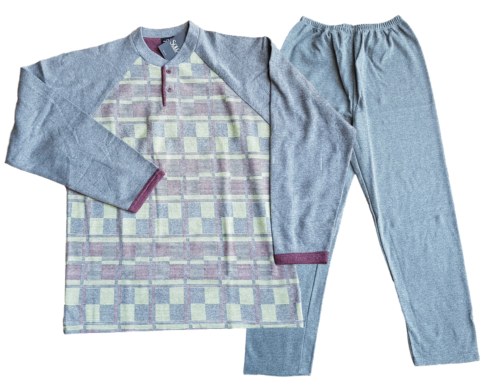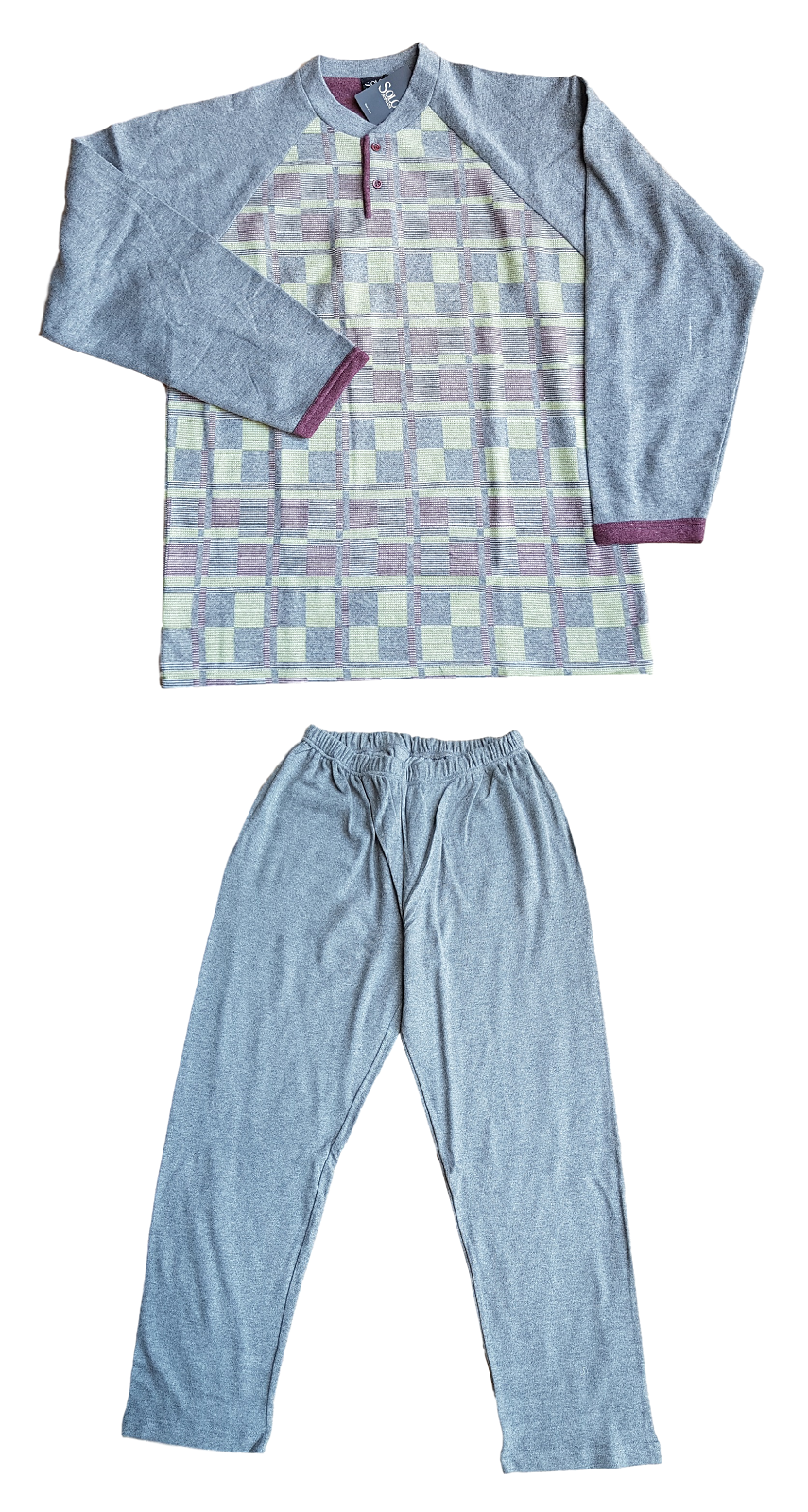 Pigiama lungo collo serafino manica lunga maglia tinta unita pantaloni a quadretti in jersey Marca: RAGNO SPORT Articolo: U100N1 Tipo oggetto: Pigiama completo Genere: Uomo Composizione: 100% cotone Periodo consigliato: Primavera Confezione: Scatola