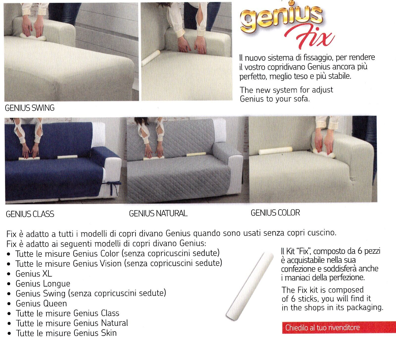 Fix è adatto a tutti i modelli di copri divano Genius quando sono usati senza copri cuscino.