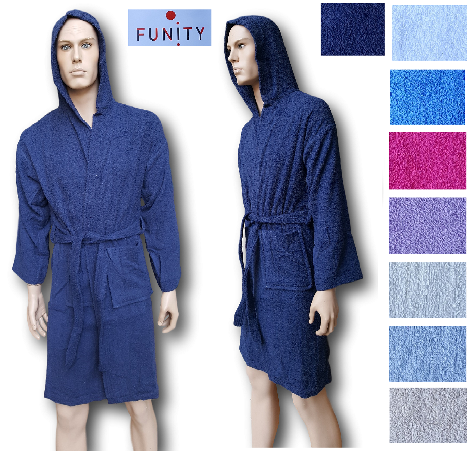 Accappatoio Unisex con cappuccio e tasche laterali in Spugna poco ingombrante di Cotone 100%.