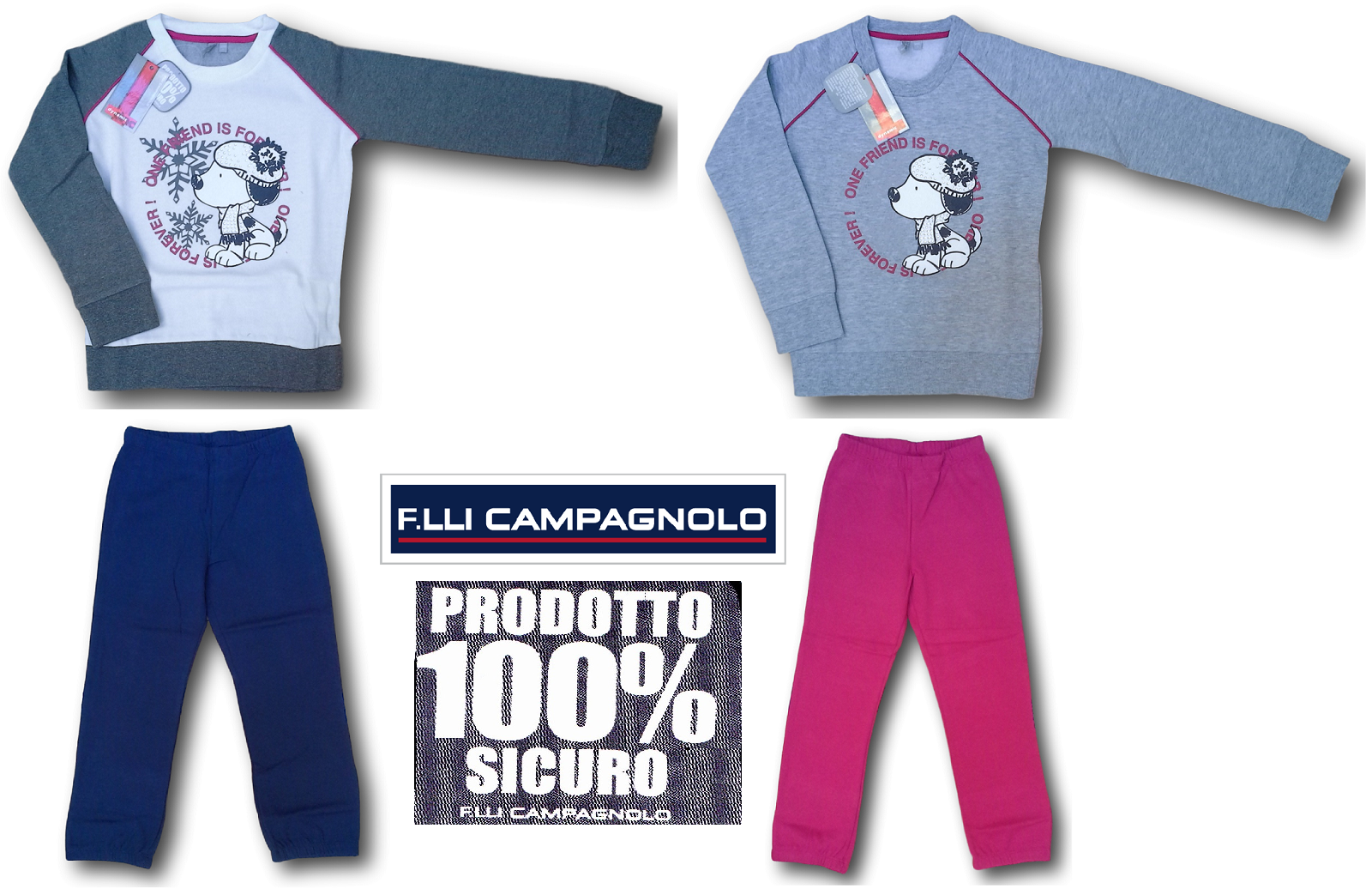 FLLI. CAMPAGNOLO Tuta bambina. Tuta invernale bambina, Maglia girocollo + Pantalone. DESCRIZIONE DEL PRODOTTO Marca: FLLI. CAMPAGNOLO Articolo: 8Q13629 Tipo oggetto: Tuta; Maglia girocollo + Pantalone Genere: Bambina Composizione: 35% Cotone - 65% Poliestere Periodo consigliato: Autunno/Inverno PRODOTTO SICURO 100% FLLI. CAMPAGNOLO, garantisce che i capi prodotti non utilizzano coloranti che rilasciano nel tempo sostanze nocive, ne fibre con residui di metalli pesanti. I capi destinati ai bimbi hanno ulteriori standard di sicurezza. Tutelano la salute di chi lo indossa e contribuiscono alla salvaguardia dell' ambiente. TI RINGRAZIAMO PER AVER VISITATO IL NOSTRO NEGOZIO !!!