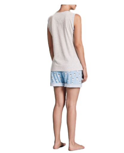 RAGNO Pigiama corto senza maniche fantasia cagnolini con fiocchetto sulla schiena short fantasia a righe con fiocchetto in vita in jersey. DESCRIZIONE Marca: RAGNO Articolo: D240NA Tipo oggetto: Pigiama completo Genere: Donna Composizione: 50% cotone - 50% Modal Periodo consigliato: Estate Confezione: Scatola