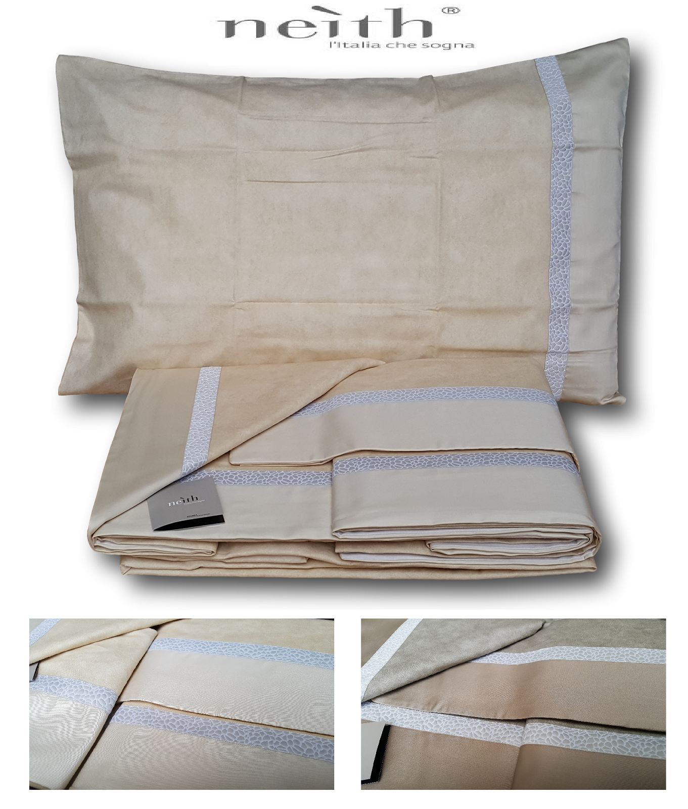 NEITH - l' Italia che sogna. Completo letto VANDA nuvolato, Lenzuola in 100% Caldo Cotone. Realizzato in Italia con tessuti esclusivi secondo gli elevati standard qualitativi che fanno del MADE IN ITALY la garanzia di un prodotto eccellente. DESCRIZIONE Marca: NEITH Articolo: PF0283 VANDA 2 Tipo oggetto: Completo Lenzuola Composizione: 100% Caldo Cotone Periodo consigliato: Autunno - Inverno Confezione: Scatola NEITH. Matrimoniale, 2 piazze Lenzuola sopra - 270 x 300 Lenzuolo sotto con angoli - 180 x 200 2 Federe - 50 x 80. MADE IN ITALY TI RINGRAZIAMO PER AVER VISITATO IL NOSTRO NEGOZIO !!!